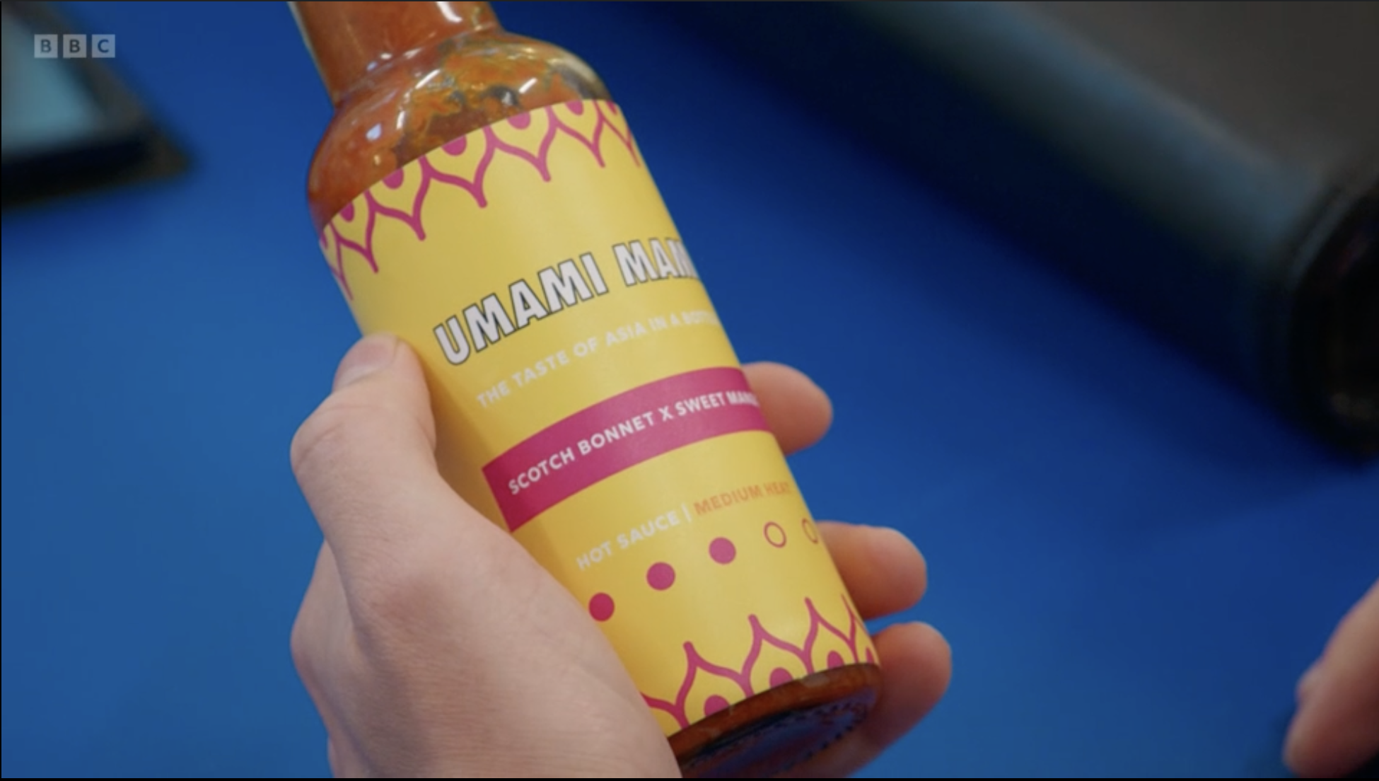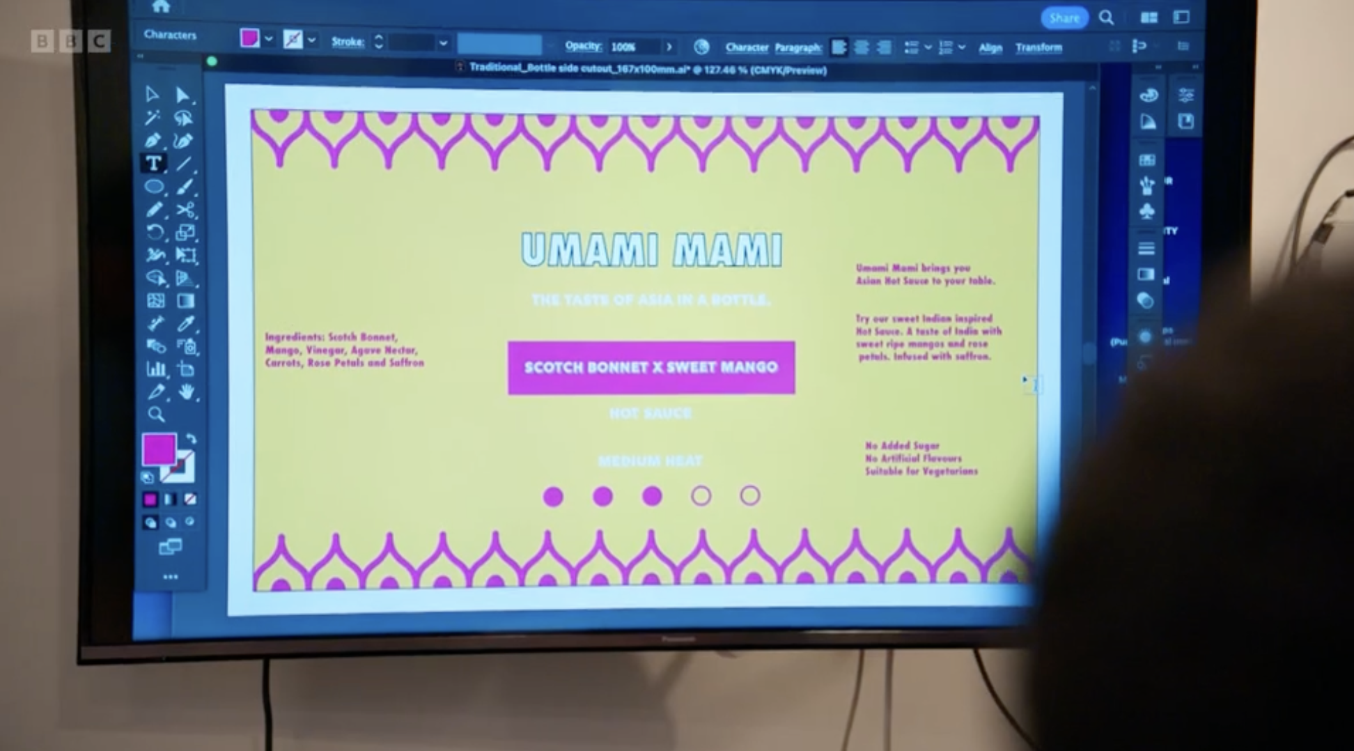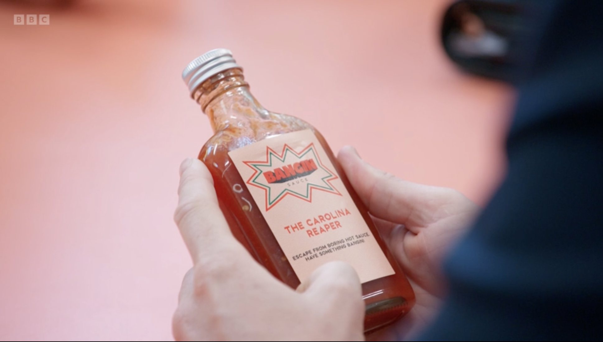 Design: Overall, the bottle design feels underwhelming. While it's the stronger of the two designs featured in the episode and includes some good ideas, like the pop art-style "bang", the use of pink as the main colour for the label makes it look a bit washed out. It doesn't convey the boldness or spiciness of the sauce, and it also reduces the contrast of the logo, making it harder to stand out.