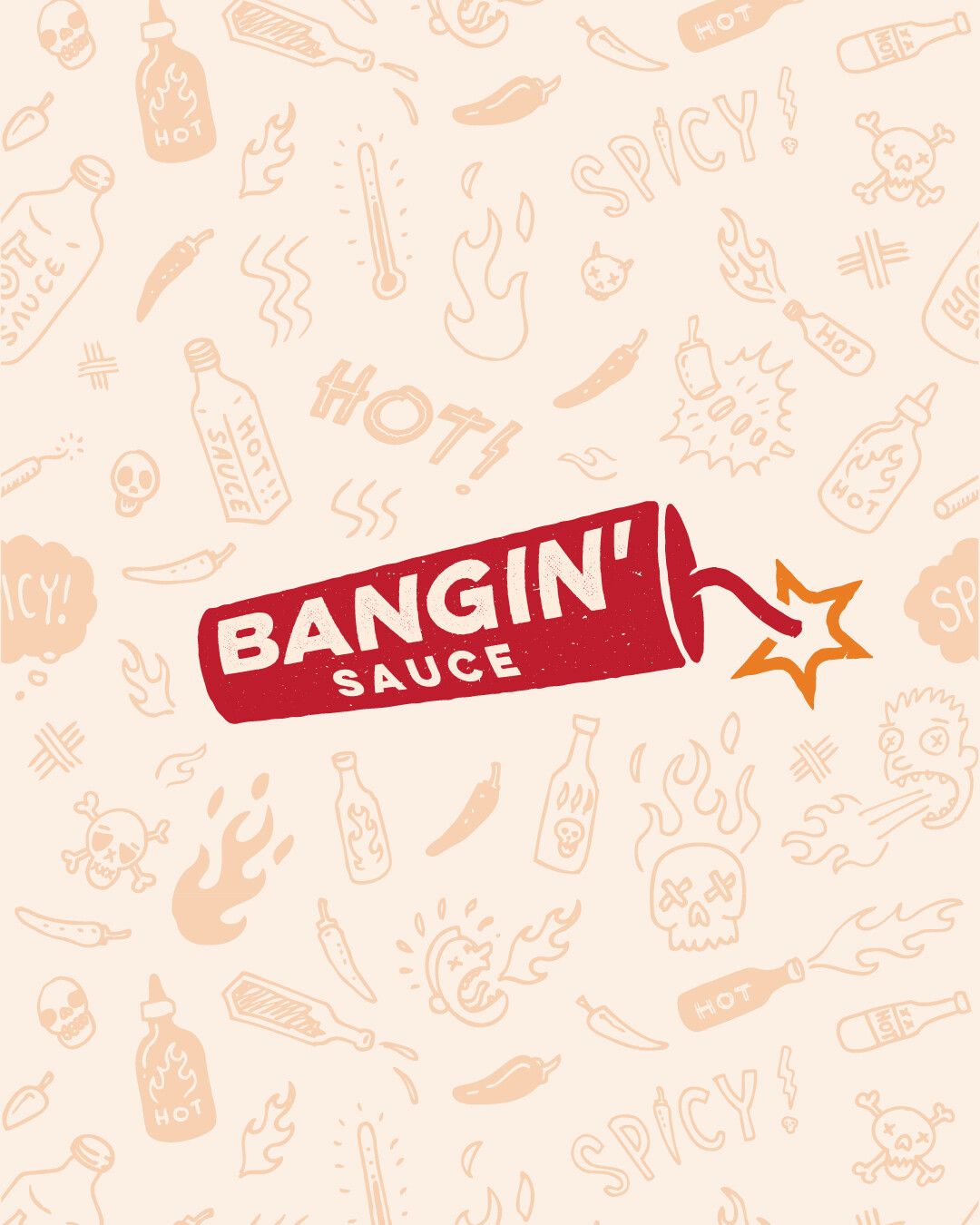 Design: The company name, "Bangin' Sauce," with the "G" dropped, suggests a playful, informal vibe. To reflect this fun approach, a bold, illustrative design is used, with the name placed inside a stick of dynamite. The dynamite is angled off-kilter to enhance the sense of energy and excitement.